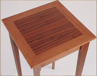 A friend gave me an extremely beautiful small piece of Brazilian Rosewood. I cut the wood into a thin piece of veneer to make the top of this small display table. The table is 15″ square, 28″ tall, and is used to display a piece of pottery. The base and the frame around the rosewood is cherry.