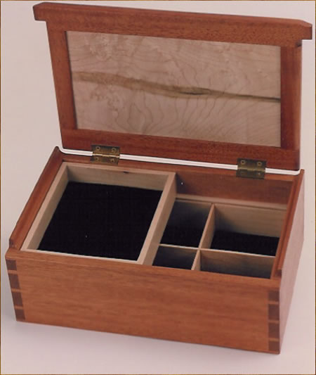 This small jewelry box is made of Honduras mahogany and figured maple. When I first started making furniture, I learned to cut dovetails using a western style fine-toothed backsaw. Several years ago, however, I had the opportunity to use a nice Japanese Dozuki saw, and became a convert to Japanese pull saws instantly.
