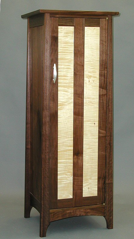 This cabinet was designed as companion piece for a large bedroom bureau that my client already owned. The walnut was harvested locally, a mile from my studio, and the beautiful figured maple was purchased from curlymaplewood.com, a specialty lumber suppler in Ohio. The narrow, vertical proportions were specifically requested by my client. The cabinet is 60″ tall, 23″ wide, and 19″ deep.