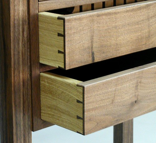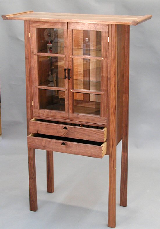 Made from local Douglas County walnut and figured maple, this cabinet stands 62″ tall and the overhanging top is 38″ wide.